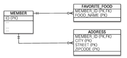 favoriteFoods는 기본 값 타입인 String을 컬렉션으로 가진다. 이것을 데이터베이스 테이블로 매핑해야 하는데, 관계형 데이터베이스의 테이블은 컬럼 안에 컬렉션을 포함할 수 없다. 따라서 아래 그림처럼 별도의 테이블을 추가하고 @CollectionTable를 사용해서 추가한 테이블을 매핑해야 한다. addressHistory도 마찬가지다.