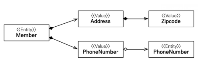 참고로 임베디드 타입은 기본 생성자가 필수이다. 또한, 임베디드 타입을 포함한 모든 값 타입은 엔티티의 생명 주기에 의존하므로 엔티티와 임베디드 타입의 관계를 UML로 표현하면 컴포지션 관계가 된다.