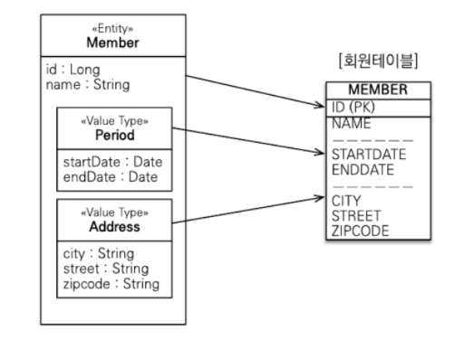 회원이 상세한 데이터를 그대로 가지고 있는 것은 객체지향적이지 않으며 응집력만 떨어뜨린다. 대신에 Period, Address와 같은 타입이 있다면 코드가 더 명확해질 것이다. @Embeddable와 @Embedded를 사용해 임베디드 타입으로 만들 수 있다. 임베디드 타입을 사용하면 재사용이 가능하고 응집도가 높아진다. 또한 Period.isWork()처럼 의미 있는 메소드를 만들 수 있다.