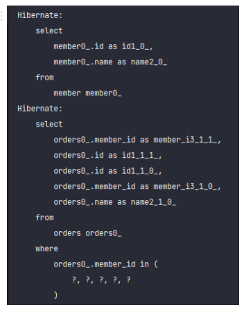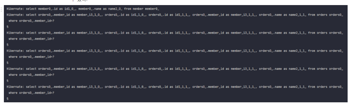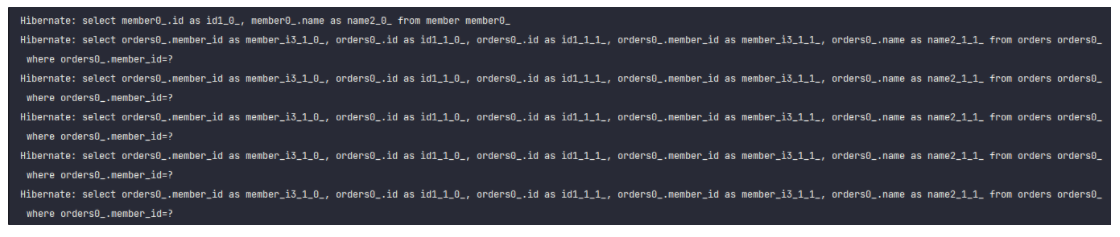 위 테스트 코드 실행하면 아래와 같이 member를 전체 조회하는 쿼리와 연관된 order를 조회하는 쿼리 5개가 발생한 것을 확인할 수 있다(N+1 쿼리 발생).