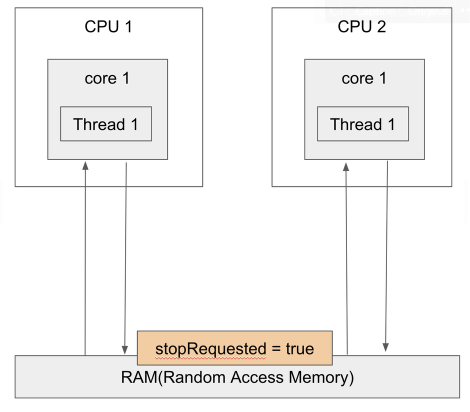 이 문제를 해결하기 위해서는 stopRequested 변수를 volatile로 선언하면 된다. 그럼 다음 그림과 같이 CPU Cache Memory를 거치지 않고 RAM으로 직접 읽고 쓰는 작업을 수행하게 된다.