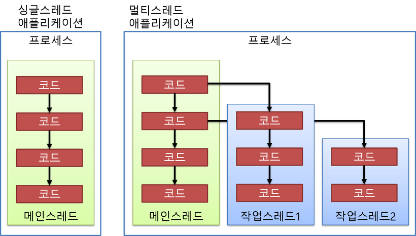 메인 스레드는 필요에 따라 작업 스레드를 만들어서 병렬로 코드를 실행할 수 있다.