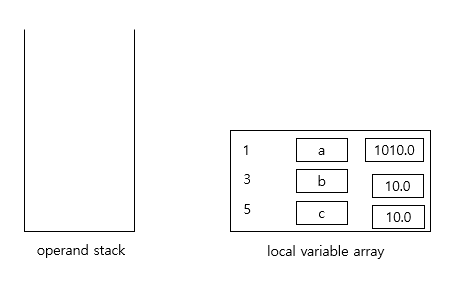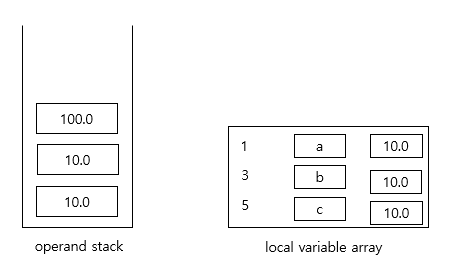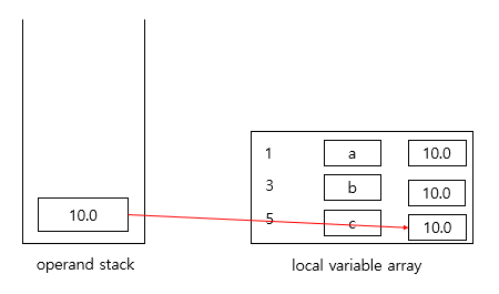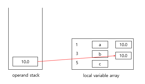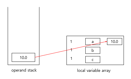 operand stack에 저장된 10.0을 pop 하여 지역 변수 배열 1번 인덱스에 저장합니다.