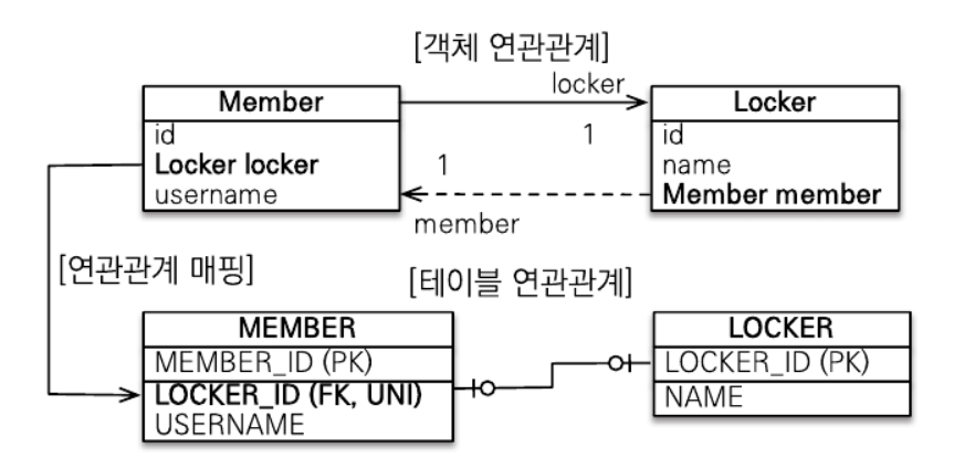 아래 그림과 같이 일대일 관계 중 대상 테이블에 외래 키가 있는 단방향 관계는 JPA에서 지원하지 않는다. 이때는 단방향 관계를 Locker에서 Member 방향으로 수정하거나, 양방향 관계로 만들고 Locker를 연관 관계의 주인으로 설정해야 한다.