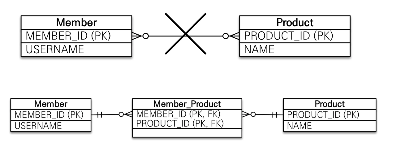 관계형 데이터베이스는 정규화된 테이블 2개로 다대다 관계를 표현할 수 없다. 그래서 보통 일대일, 다대일 관계로 풀어내는 연결 테이블을 사용한다.