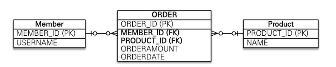 @ManyToMany를 사용하면 연결 테이블을 자동으로 처리해주므로 도메인 모델이 단순해지고 여러 가지로 편하다. 하지만 이 매핑을 실무에서 사용하기에는 한계가 있다. 예를 들어 회원이 상품을 주문하면 연결 테이블에 단순히 주문한 회원 아이디와 상품 아이디만 담고 끝나지 않는다. 보통은 연결 테이블에 주문 수량 컬럼이나 주문한 날짜 같은 컬럼이 더 필요하다.